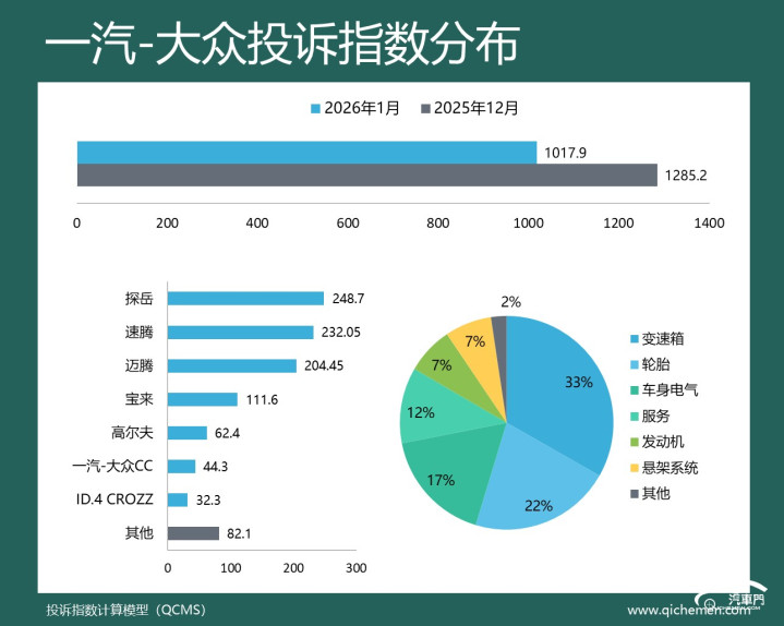 汽车质量投诉点评:去年12月投诉指数大涨的一汽-大众,1月份投诉指数有所下降。但从投诉反馈来看,变速箱机电单元故障仍然被大量车主投诉。迈腾、速腾、CC、探越等多款车型都有大量案例。与此同时,宝来和速腾的轮胎开裂问题本月也再次遭到了众多车主的投诉。此外,还有少部分迈腾、宝来和ID.4车主投诉悬架吃胎偏磨问题,2023款车型是主要爆发点。