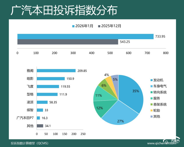 汽车质量投诉点评:上个月短暂缺席之后,广汽本田再次回到了前五名,的投诉指数大幅上升了三成以上。这背后,发动机异响问题成了广汽本田投诉指数大涨的推手,该问题的投诉指数占比接近20%。飞度、锋范、缤智的老车型成了问题重灾区。与此同时,被投诉已久的遮阳帘卡口断裂和转向异响问题也遭到了很多老车主的不满。皓影是主要吐槽对象。此外,雅阁的悬架吃胎偏磨问题也招致了小部分用户的不满。